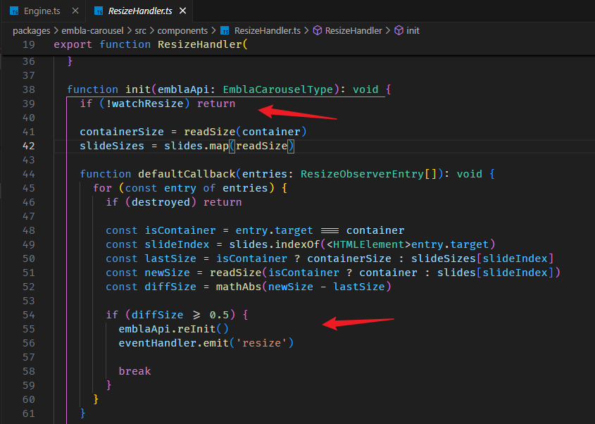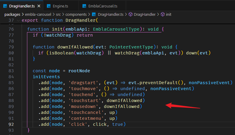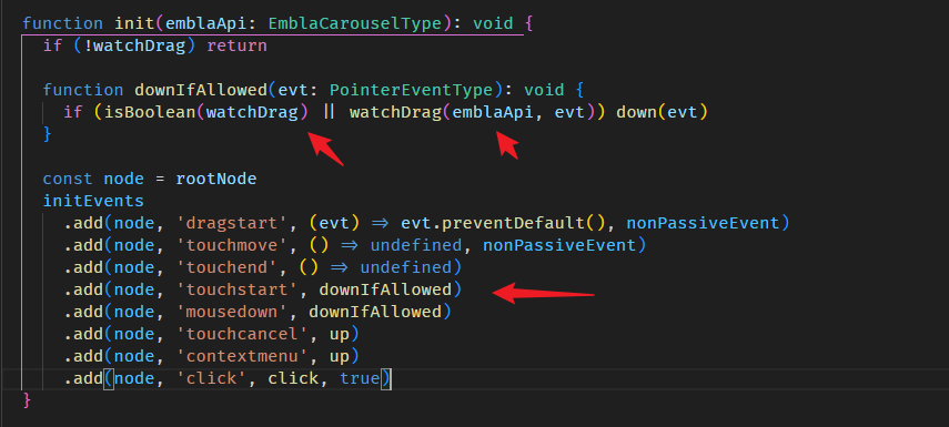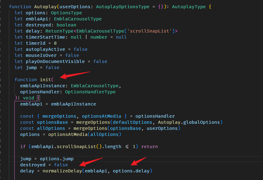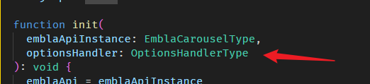init 方法会被 Embla 调用,调用的时候会传入两个参数,第一个是 EmblaCarousel 对象,第二个是 OptionsHandler 对象。