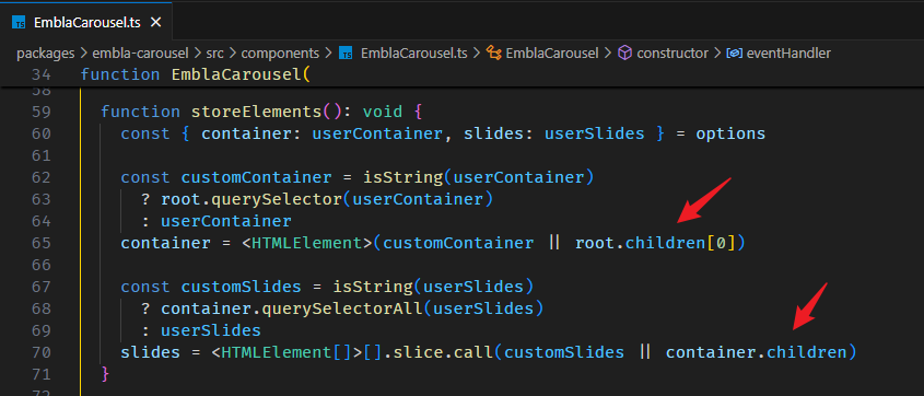 import emblaCarousel from 'embla-carousel'; const sliderElement = document.querySelector<HTMLElement>('.slider')!; const slider = emblaCarousel(sliderElement, { container: '.slide-list', slides: '.slide', });