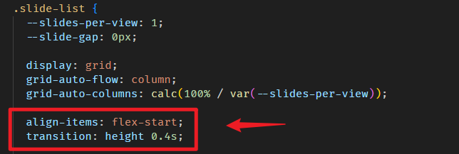 .slider { max-width: 512px; overflow: hidden; .slide-list { display: flex; .slide { flex-shrink: 0; width: 100%; img { width: 100%; height: auto; aspect-ratio: 16 / 9; object-fit: cover; } } } }