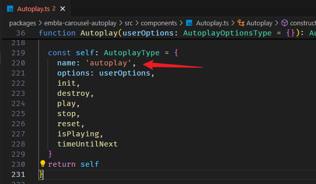 所有 plugin 对象都要有 name, options, init, destroy 属性和方法,这些都是 Embla 需要用到的,另外我们还可以定义其它属性方法让我们自己用,比如上图里的 value 和 doSomething。