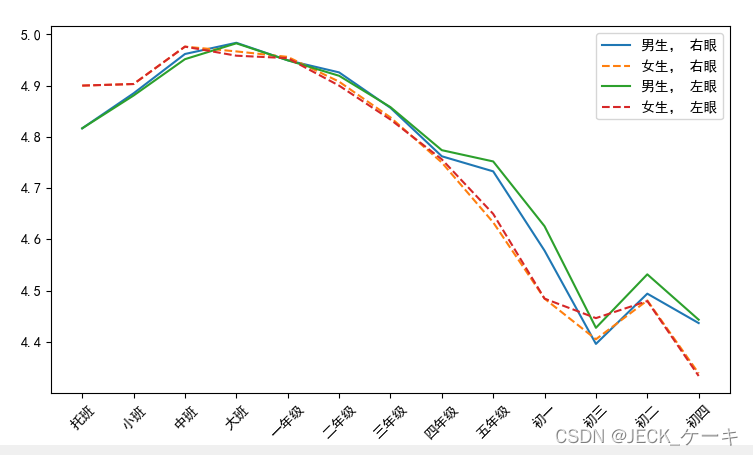 可以看出,视力的顶峰是一年级时期。或者大班时期,这时候,视力发育成熟,基本都是5.0.从小学开始,一路下降。