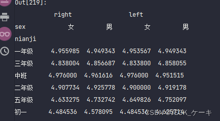 x = df.groupby(['nianji', 'sex'])['right', 'left'].mean().unstack()