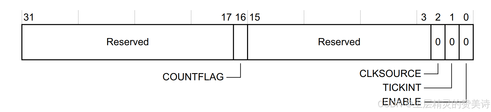 [1] | TICKINT | 1:如果计数器递减为0,发出异常请求 0:如果计数器递减为0,不发出异常请求 |