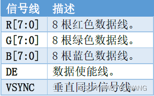 R[7:0]、G[7:0]和B[7:0]这24根是数据线,DE、VSYNC、HSYNC和PCLK这四根是控制信号线