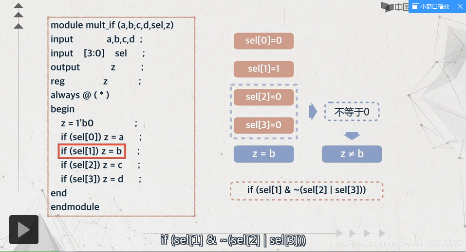解释:如果仅仅的将sel【1】z=b;放在最后,这与原逻辑是不一致的,因此应该敬z=b满足的条件统统放在最后;