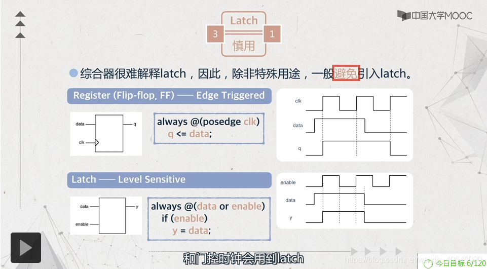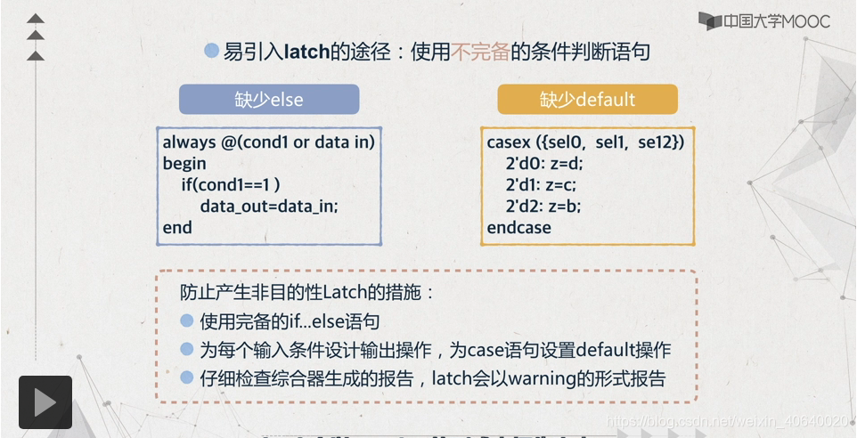解释:通常非特殊用途应避免latch的产生,通常在门控时钟或异步电路会用到。