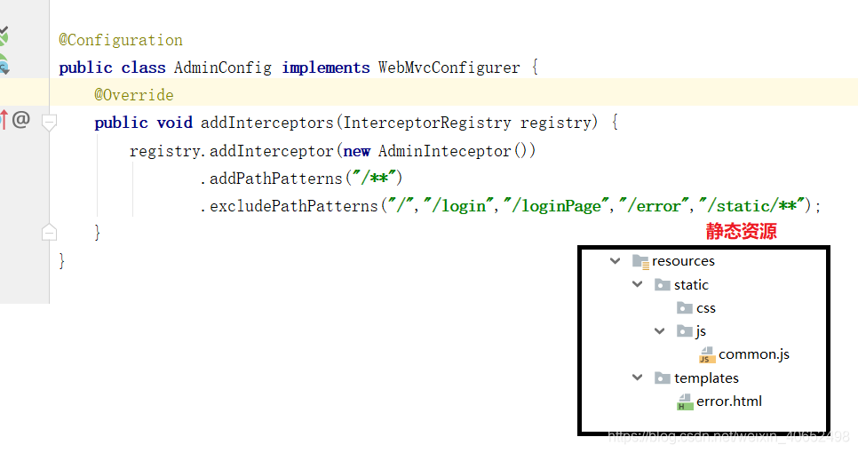 但是因为有拦截器的存在,所以静态资源不能写根目录,故需要设置个静态路径