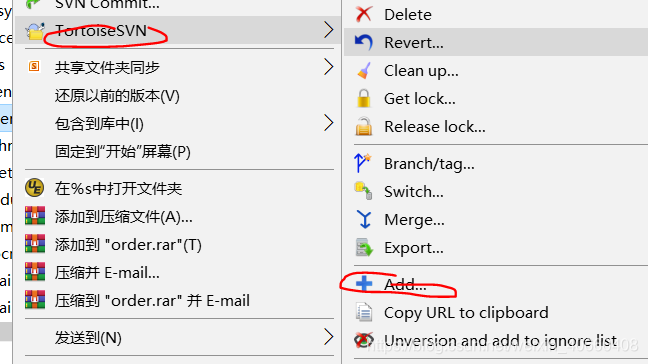 在刚才得到的本地仓库中将自己要提交的项目文件夹直接复制到该仓库文件夹下,右键项目文件夹,选择TortoiseSVN -----add