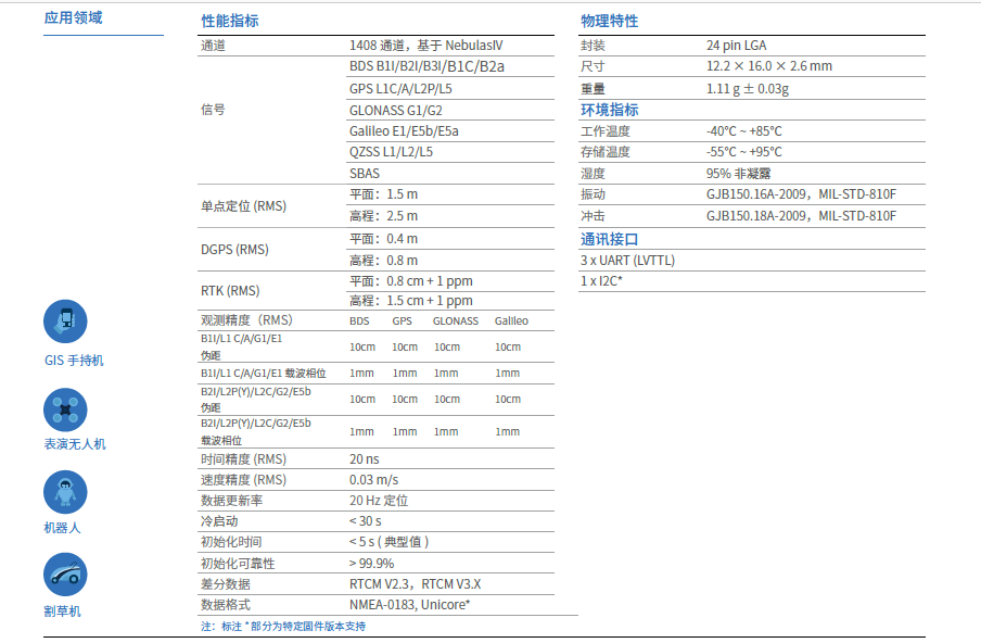 UM960该定位模块支持全系统多频点RTK解算,其性能指标部分可以划分为信号跟踪模块、定位精度模块、观测量精度模块、功能模块以接口模块。
