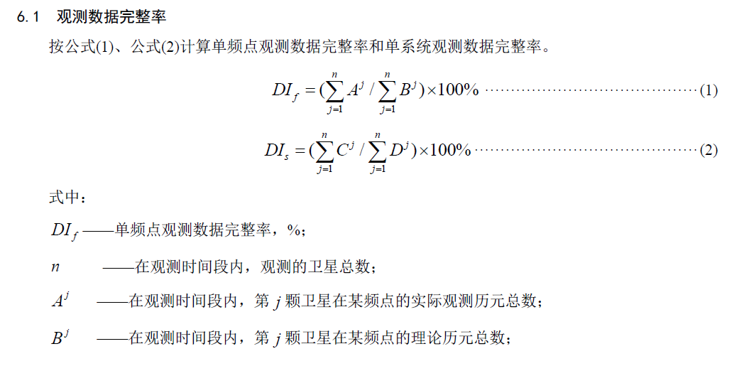 定义:观测数据完整率是接收机观测到卫星的实际历元数据量与理论历元数据量的比值。具体计算公式来源于参考文献(2)的6.1节介绍。