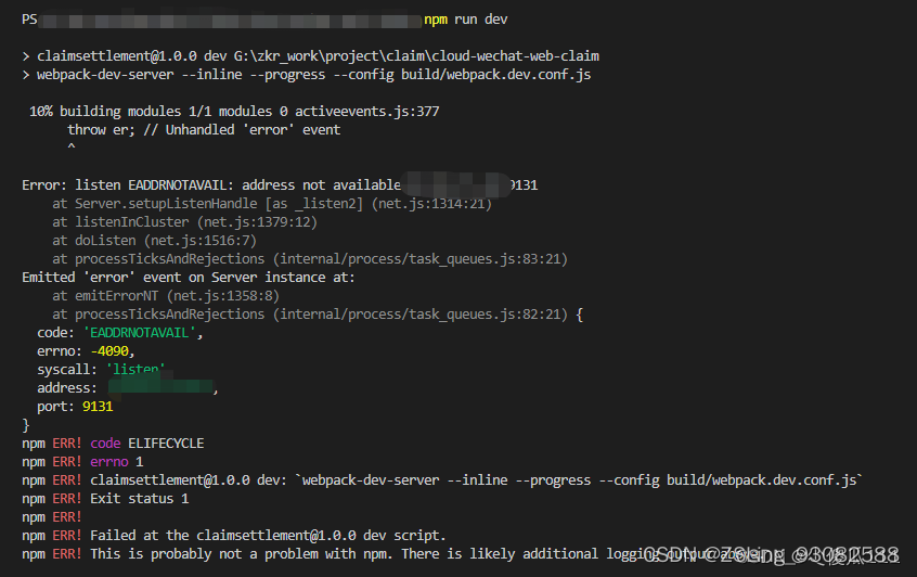 vue项目npm run dev失败10% building modules 1/1 modules 0 activeevents.js:292 throw er,npm ERR! 过百度了解到由于config中index.js中host需要进行本地配置,修改成本地ip,以及修改对应的target,即可解决**一直以为是node_modules文件包出错,删除,然后npm install始终不可以,还是报错。