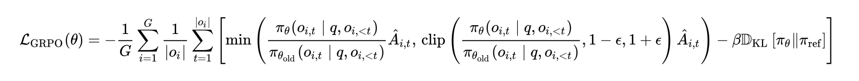 - ri,t=πθ(oi,t|q,oi,<t)πθold(oi,t|q,oi,<t) r i , t = π θ ( o i , t | q , o i , < t ) π θ o l d ( o i , t | q , o i , < t ) 是重要性采样权重,表示当前策略 πθ π θ 生成词元 oi,t o i , t 的概率与旧策略 πθold π θ o l d 生成该词元概率的比值。