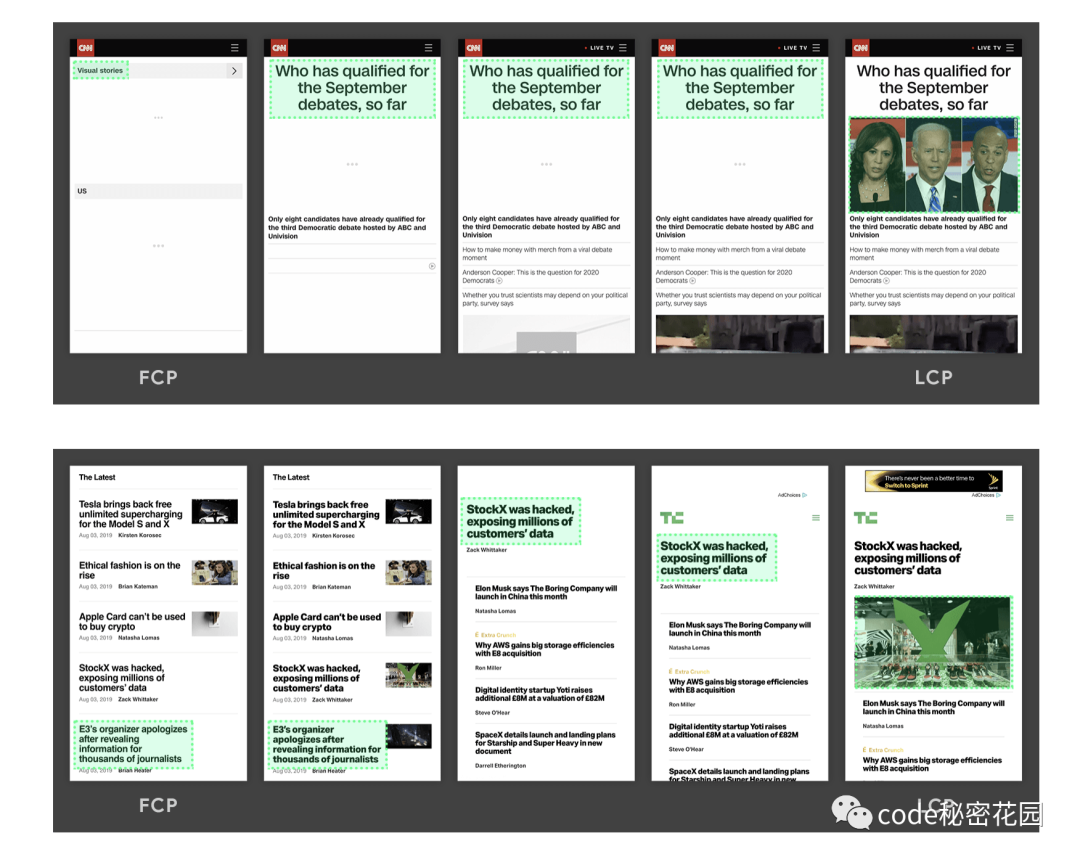 在以上两个时间轴中,最大的元素随内容加载而变化。在第一个示例中,新内容被添加到 DOM 中,并且更改了最大的元素。在第二个示例中,布局发生更改,以前最大的内容从视口中删除。通常情况下,延迟加载的内容要大于页面上已存在的内容。