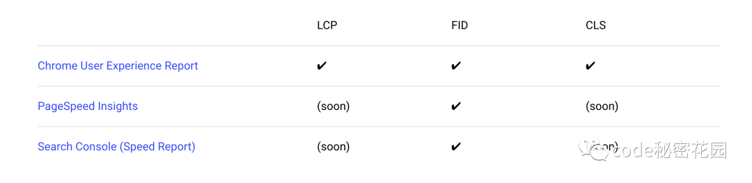 Google 认为,Core Web Vitals 对于所有网络体验都至关重要。因此,它致力于在其工具中显示这些指标,下面是现有工具中指标的支持情况:
