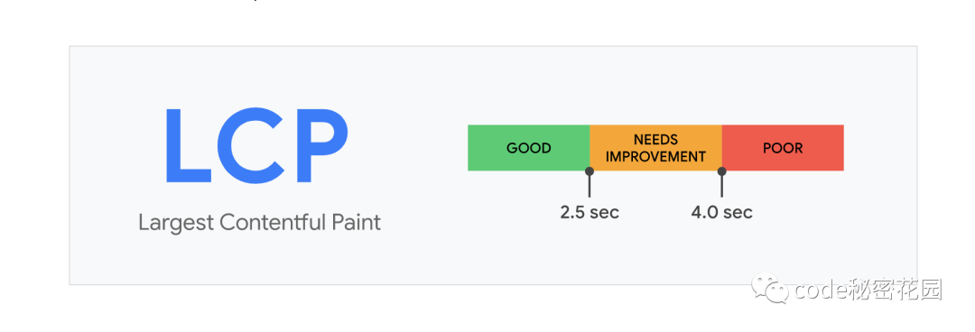 Largest Contentful Paint (LCP) 用于衡量标准报告视口内可见的最大内容元素的渲染时间。为了提供良好的用户体验,网站应努力在开始加载页面的前 2.5 秒内进行 最大内容渲染 。