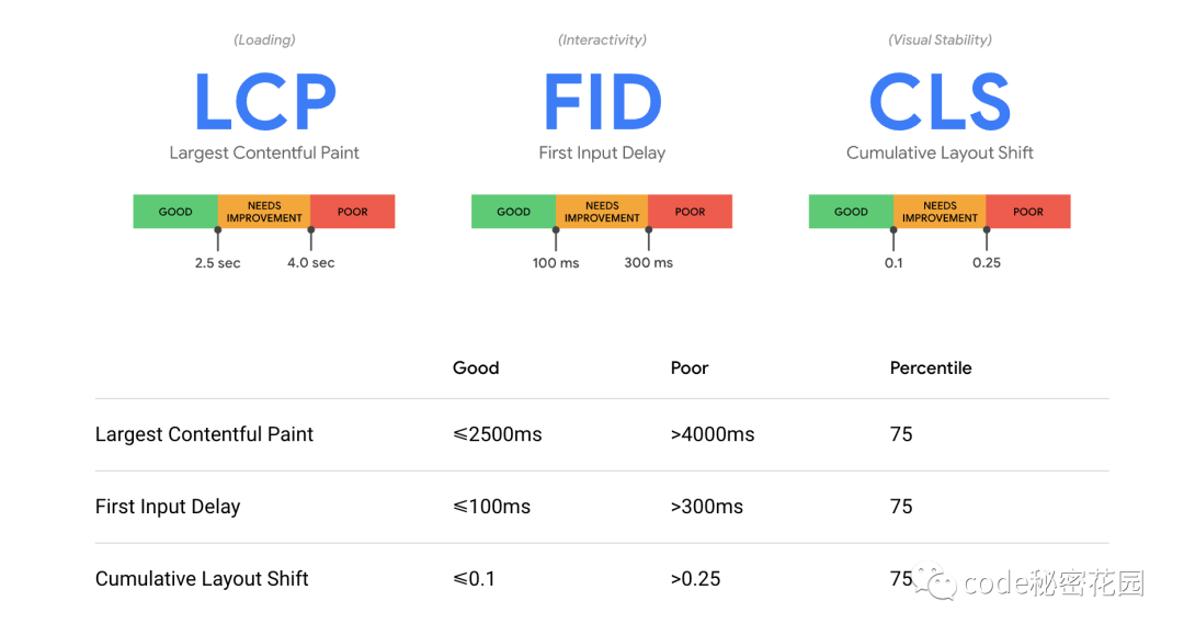 Largest Contentful Paint (LCP): 衡量加载体验:为了提供良好的用户体验,LCP应该在页面首次开始加载后的2.5秒内发生。First Input Delay (FID): 衡量可交互性,为了提供良好的用户体验,页面的FID应当小于 100毫秒。Cumulative Layout Shift (CLS):衡量视觉稳定性,为了提供良好的用户体验,页面的CLS应保持小于 0.1。