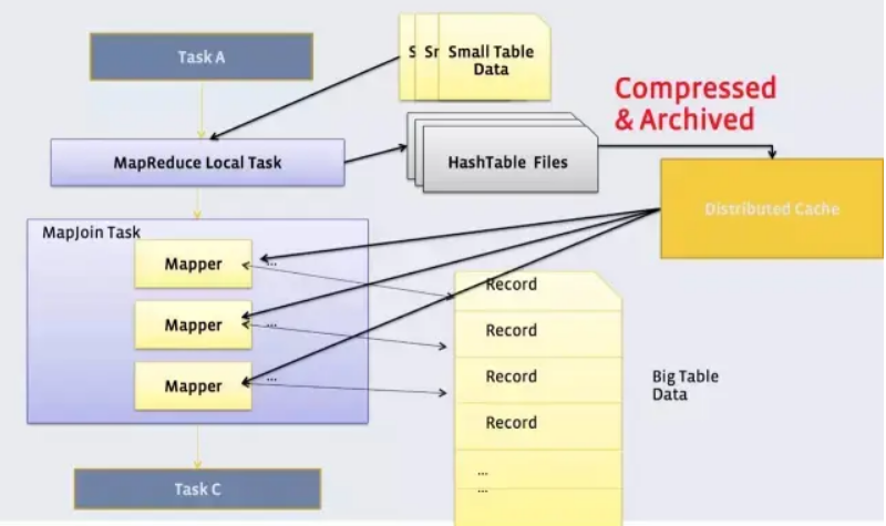 - 原理如上图,用户可以手动指定哪个表是小表,然后在客户端把小表打成一个哈希表序列化文件的压缩包,通过分布式缓存均匀分发到作业执行的每一个结点上。然后在结点上进行解压,在内存中完成关联。