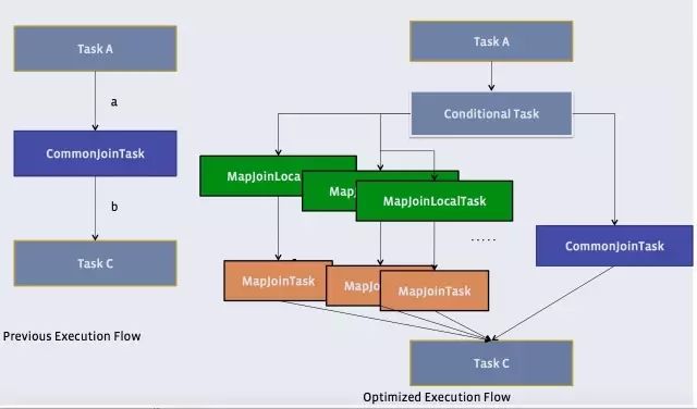- 优化过程是把Join作业前面加上一个条件选择器ConditionalTask和一个分支。左边的分支是MapJoin,右边的分支是Common Join(Reduce Join)
