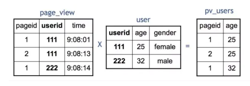 - FROM page_view pv JOIN user u ON (pv.userid = u.userid);