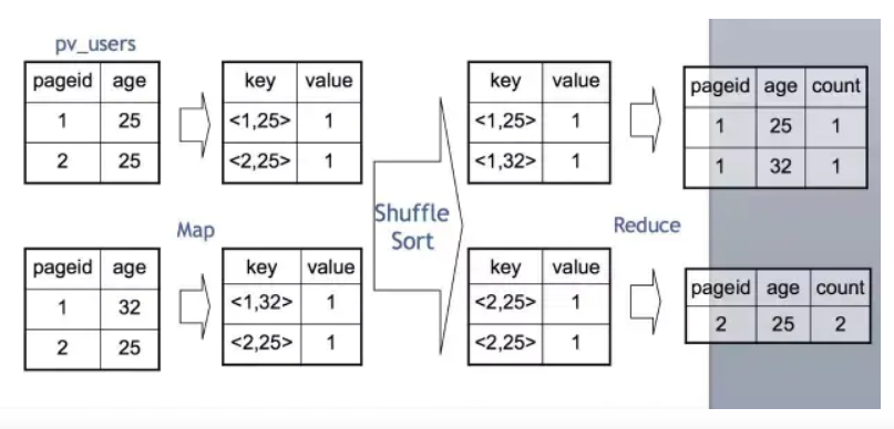 - 首先在Map端,每一个Map读取一部分表的数据,通常是64M或者256M,然后按需要Group By的Key分发到Reduce端。经过Shuffle Sort,每一个Key再在Reduce端进行聚合(这里是Count),然后就输出了最终的结果。