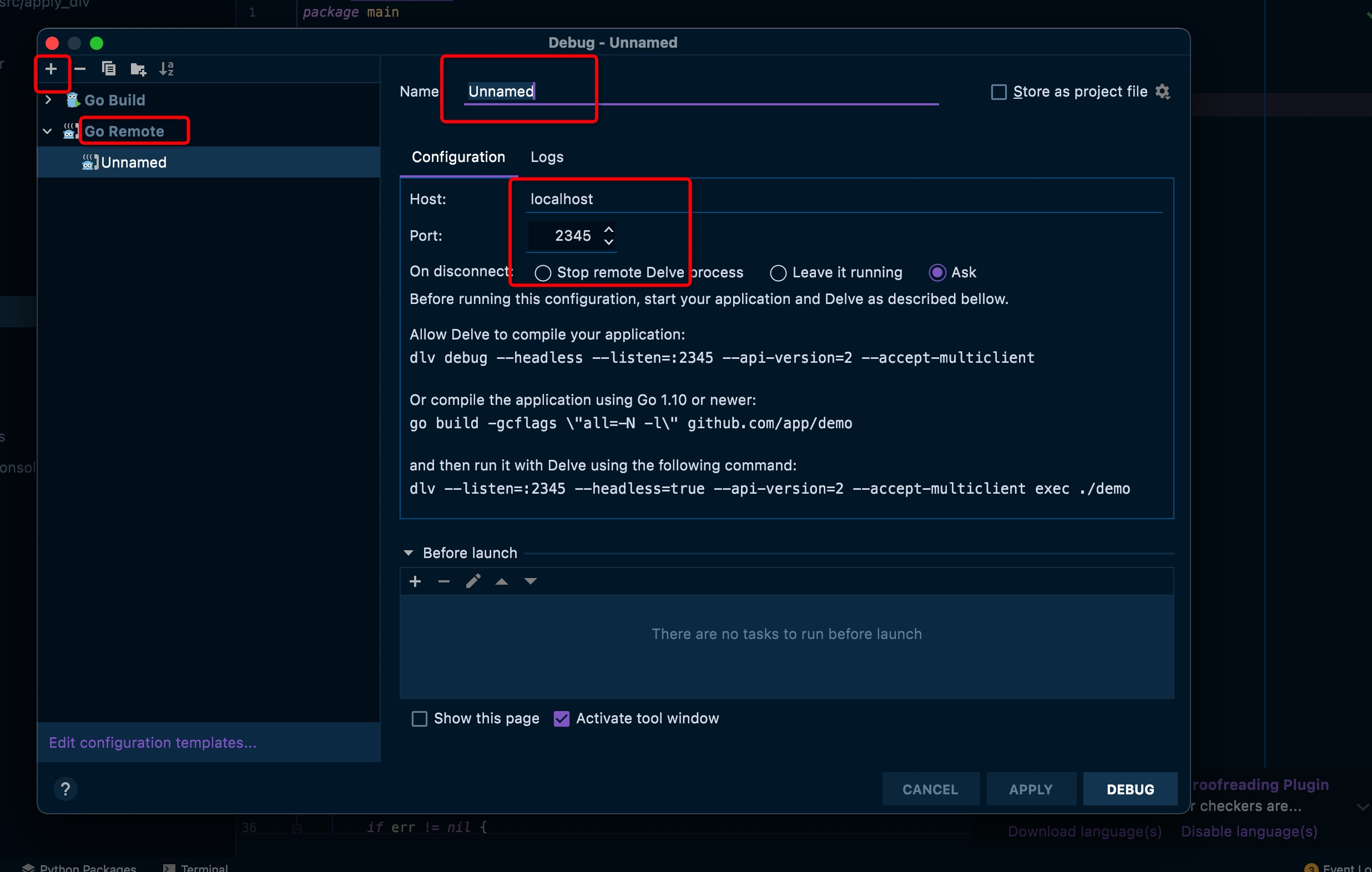 添加一个 Go Remode : 命名随意,Host 和 Port 配置你使用dlv 启动的程序监听