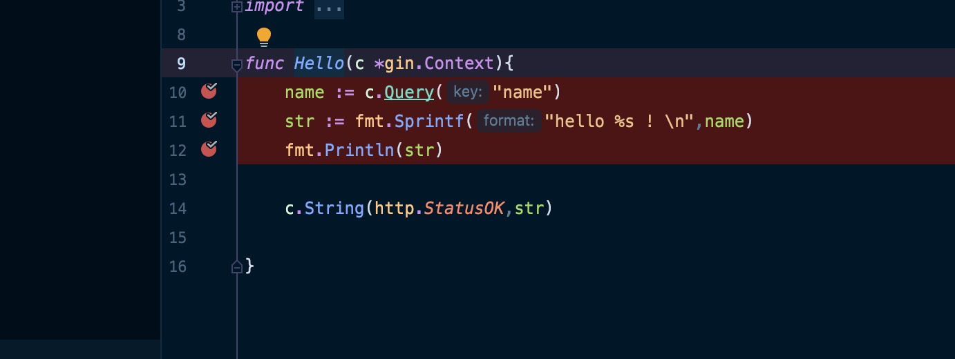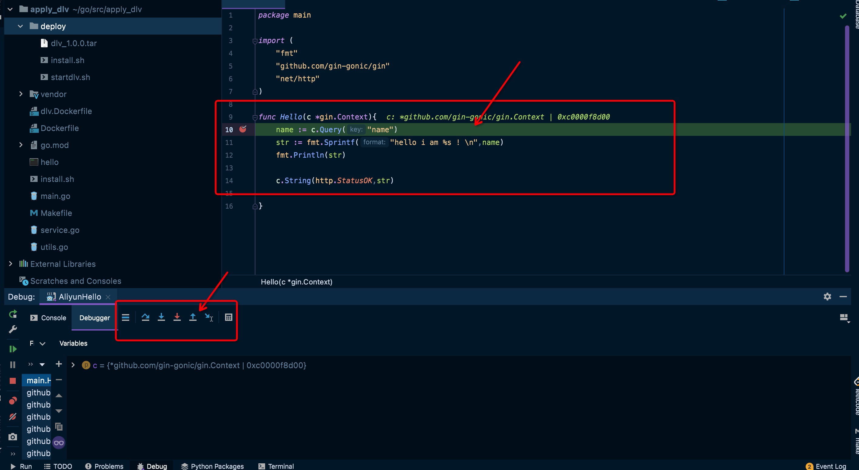 使用 dlv debug 命令直接进行源码的编译,以及断点设置,并使用命令查看断点处的参数等信息
