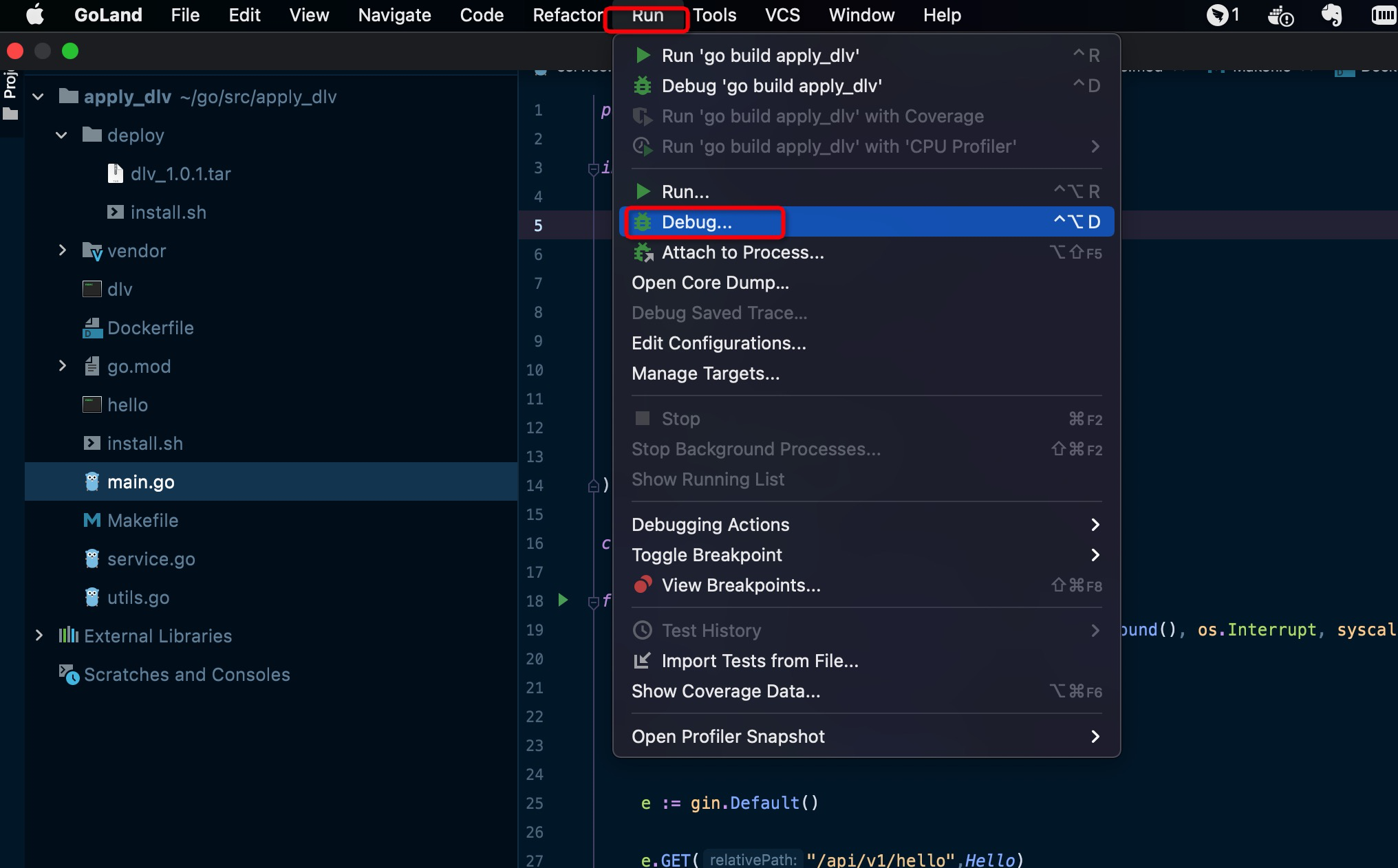 - dlv debug:编译源文件并开始调试,这里应和 main 函数位于同一目录,或者指定完整的 main 函数路径