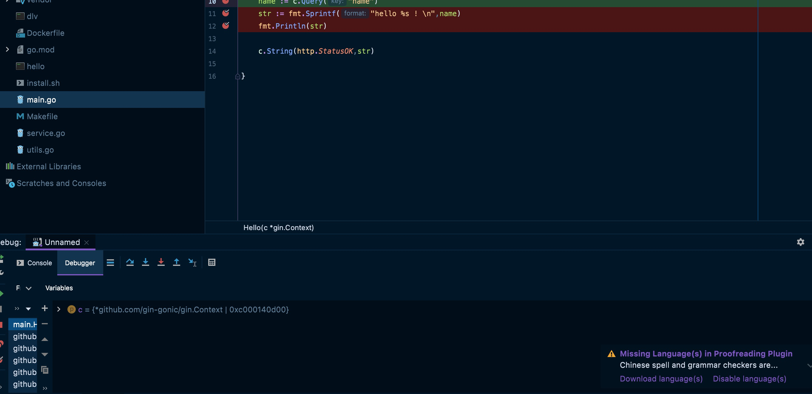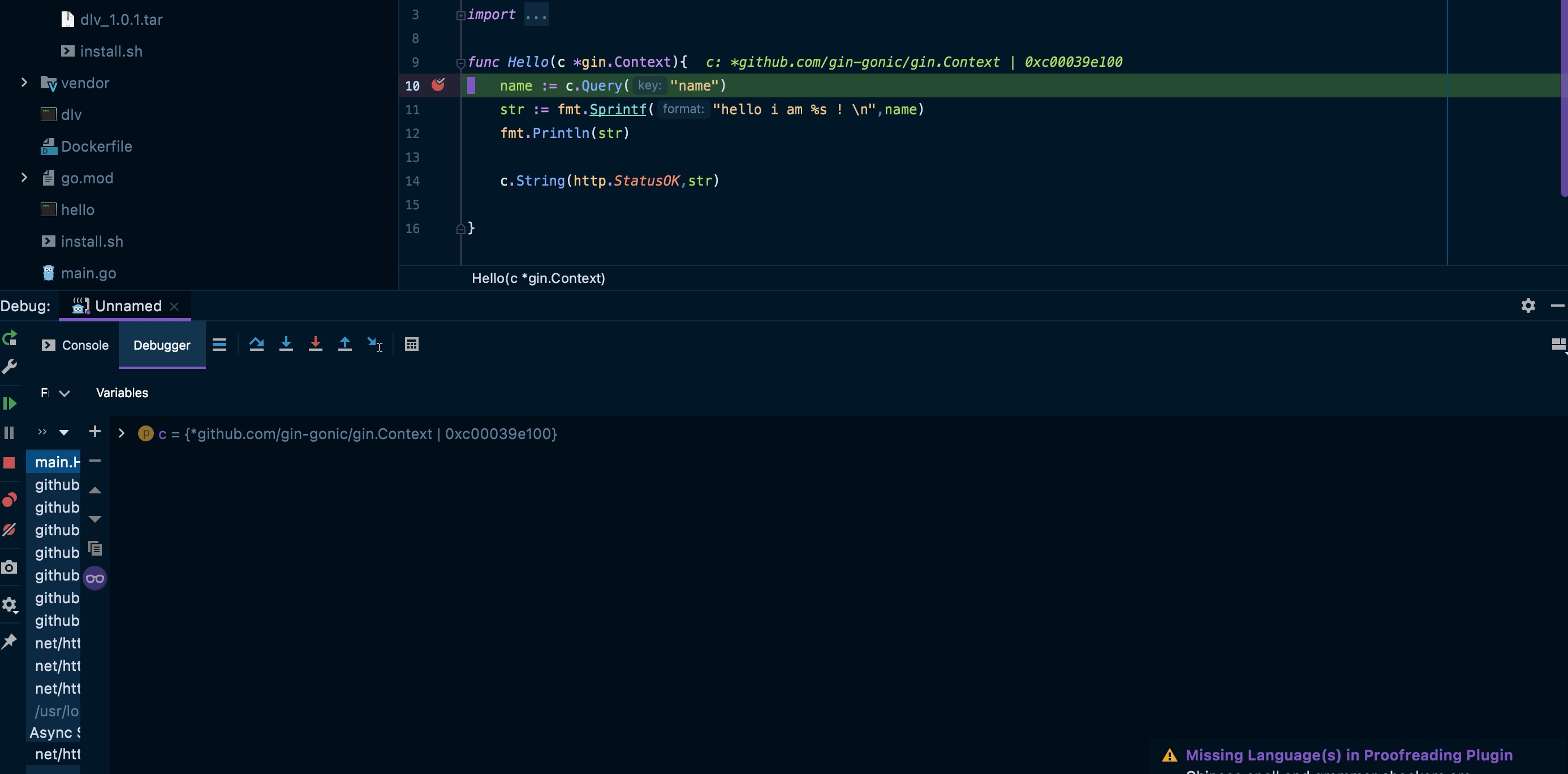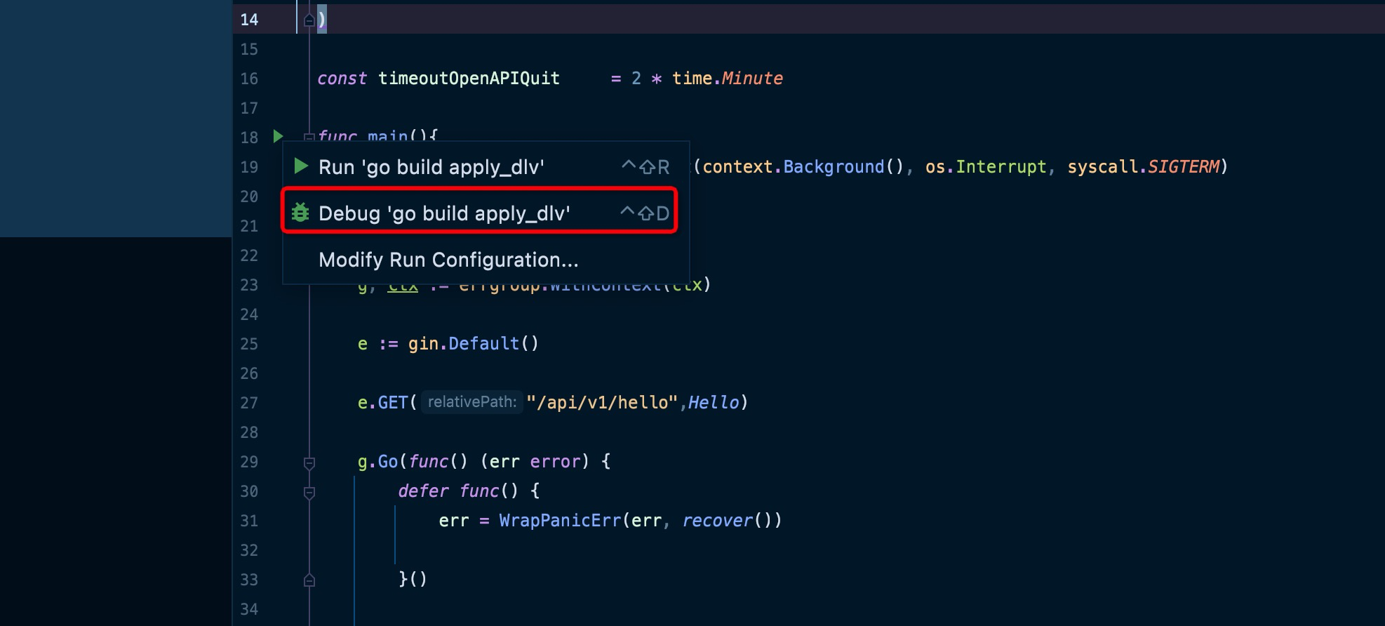 这样做是十分麻烦的,这个介绍只是让我们理解dlv是如何工作的。一般我们都会结合 idea 进行界面化的调试,那么接下来我们以goland为例子进行 debug 调试。
