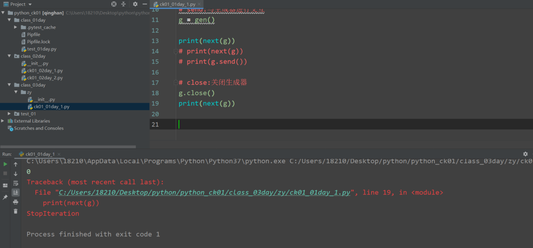 2.4throw()方法:在生成器内部主动引发一个异常。参数:1.异常类型。2.异常信息。