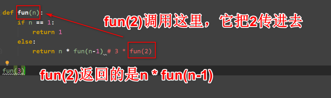 再次调用fun(2),再进来,前面return n * fun(n-1)这一截得到 2,fun(3-1)得到 2,所以最终得到4*3*2* fun(1)。
