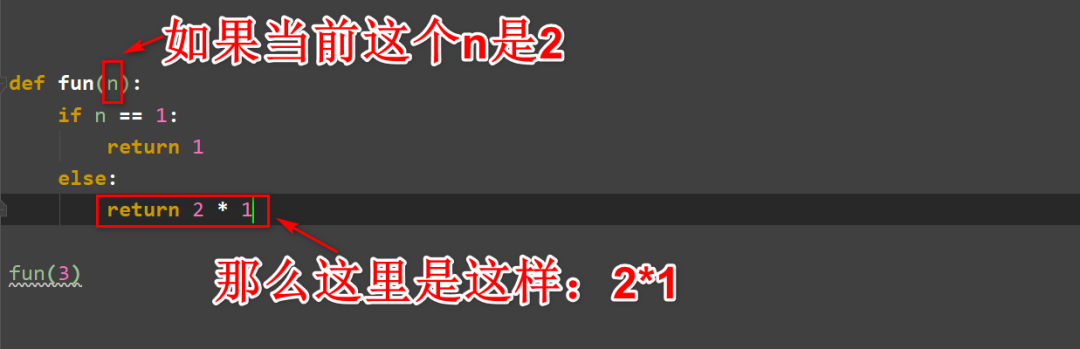 这里的 n 是个 3,fun(n-1)就是fun(2),那么就是3 * fun(2)。