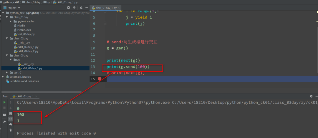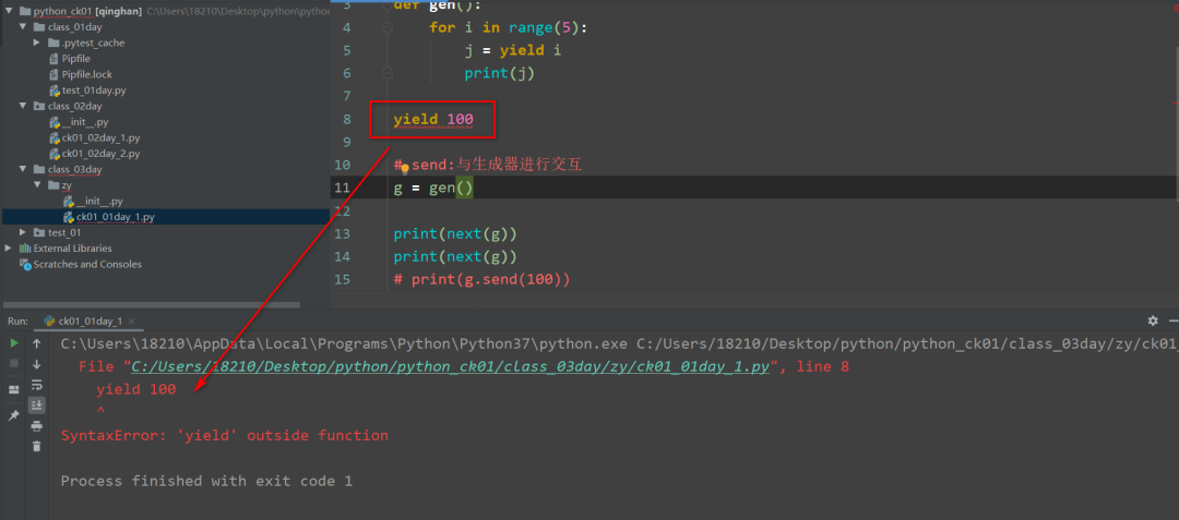 这里send(100)这个值进去的话,在这里运行,直接运行for i in range(5):这个语句,send(100)生成进去的这个值没有地方接收,所以报错了。
