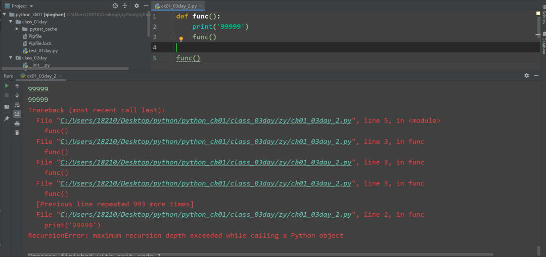 Pycharm 有个检测机制: 当它内部检测到这个是个无限递归,没有递归临界点的一个递归函数,那么这个时候,它递归多少次之后,会自动给终止了。
