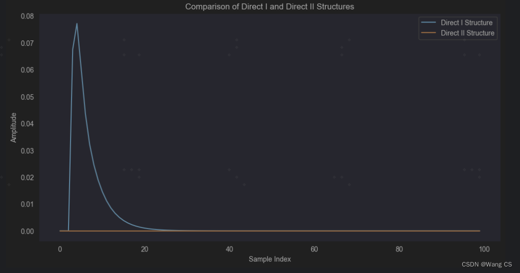 IIR滤波器的结构比较(Direct I and Direct II Form) 存储需求直接 I 型结构需要更多的存储,因为它需要存储输入和输出的延迟项。直接 II 型结构需要较少的存储,因为它只需要存储中间变量的延迟项。数值稳定性直接 II 型结构通常比直接 I 型结构具有更好的数值稳定性,特别是对于高阶滤波器。这是因为直接 II 型结构在计算过程中减少了中间变量的累积误差。实现复杂度直接 I 型结构实现较为简单,直接根据传递函数进行计算。直接 II 型结构实现稍微复杂,需要将滤波器分解为两个部分来计算。
