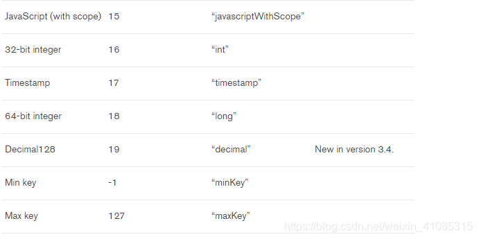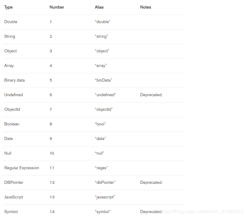 类型判断:$type 例如: { field: { $type: <BSON type> } }