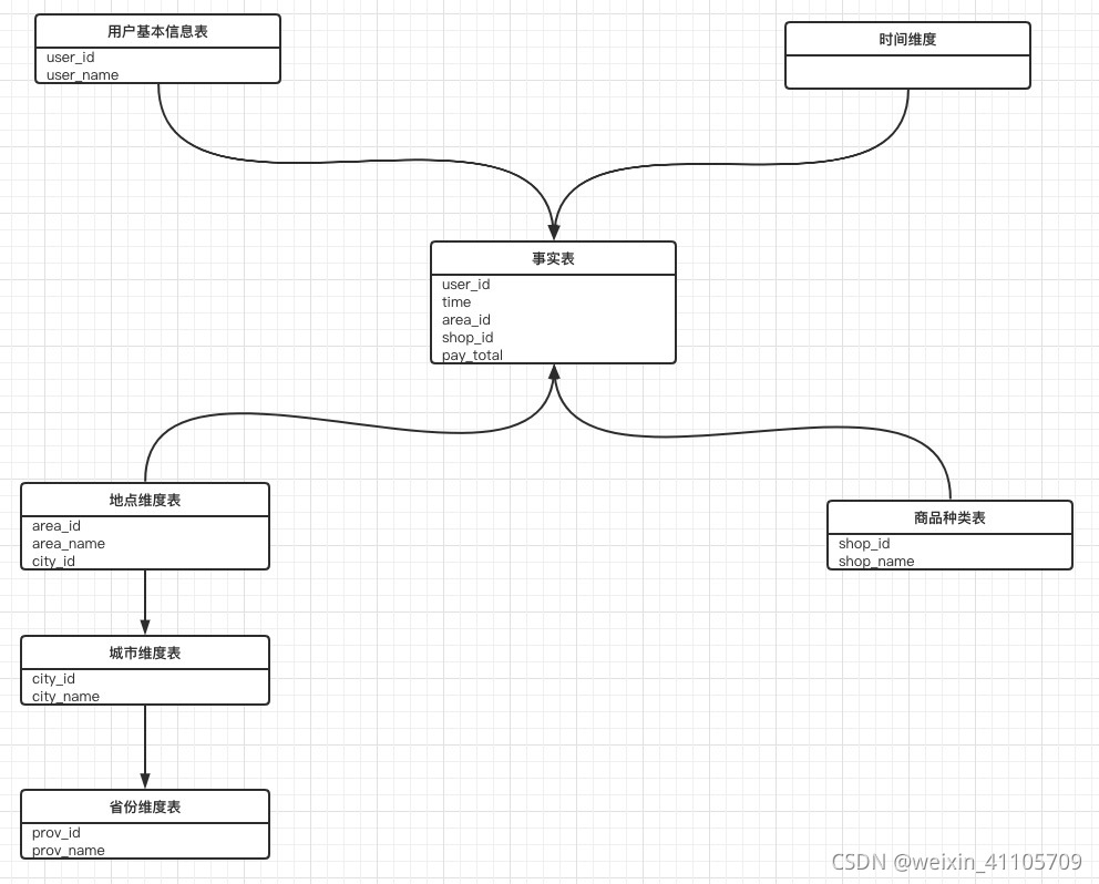 雪花模型:雪花模型是对星型模型的扩展,维表可向外连接子维表,如下面这个建模方式,事实表记录如果想知道城市名称和省份名称得通过地点表与城市表和省份表进行嵌套关联才能获取;
