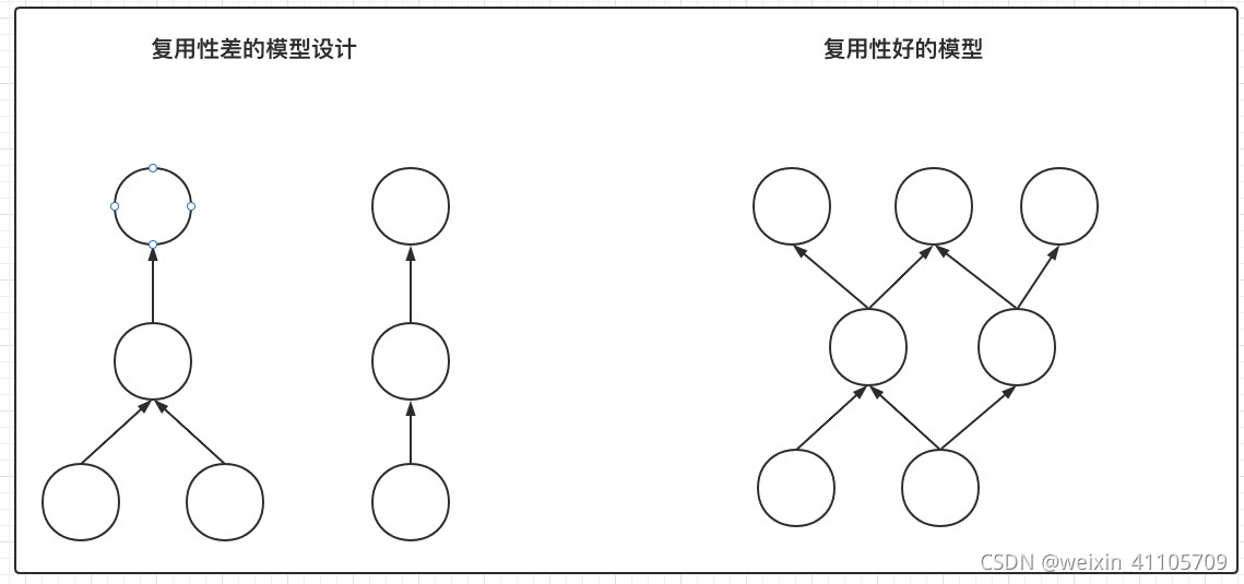 数据中台模型设计的核⼼是追求模型的复⽤和共享,通过元数据中⼼的数据⾎缘图,可以看到,⼀个⽐较差的模型设计,⾃下⽽上是⼀条线。⽽⼀个理想的模型设计,它应该是交织的发散型结构;
