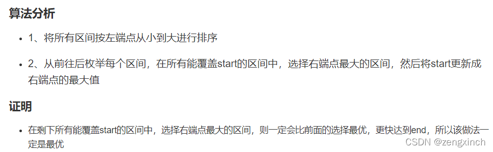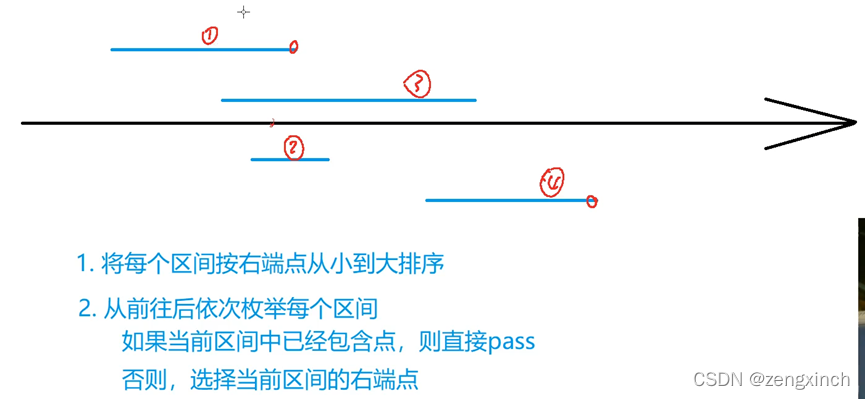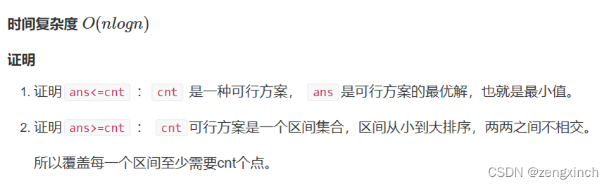 2.ans<=cnt:按照这种套路选完后,每个区间至少包含一个这样的点(这道题没听懂y总讲的,按照这句话何905的思路,这样做完后,每个区间至少有一个点,那么不存在某一个区间可以被选,但是没有选的情况,所以它就是最大的)