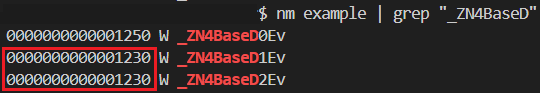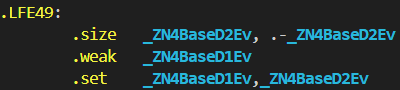 因为在我们的例子中,不涉及虚基类,因此complete object destructor和base object destructor的实现可以是一样的,编译器将符号 _ZN4BaseD1Ev 作为 _ZN4BaseD2Ev 的别名,两者对应相同的地址,共享同一份函数代码。