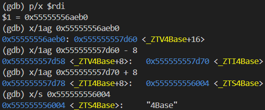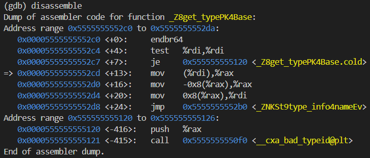 这段汇编代码的大致含义是:先检查入参,若是 nullptr ,则抛出 bad_typeid 异常(注意这里传给 typeid 的是 *p ,因此会校验空指针,因为空指针不能解引用);否则,从虚函数表开始,逐步找到typeinfo name信息,即 std::type_info::__name 成员,然后参数执行 std::type_info::name() 返回字符串常量。详细解释下实现 typeid 的3句核心汇编代码。