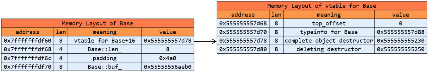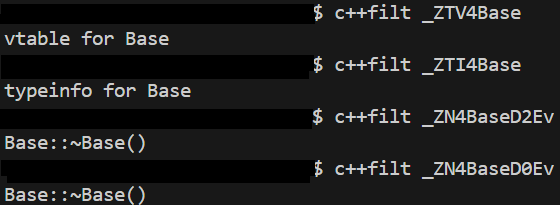 细心的读者可能发现了,根据前面的截图,vtable中的析构函数应该是base object destructor( _ZN4BaseD2Ev ),而我给出的图示中,写的却是complete object destructor( _ZN4BaseD1Ev ),为什么?