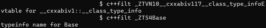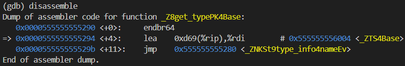 # %rax - 8: vtable首地址 + 8的位置,如前所述,这里存放的是指向typeinfo信息,