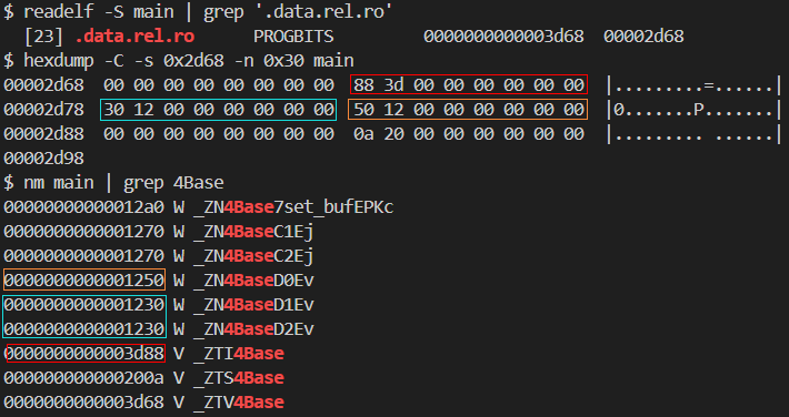 可以看到,是存储在.data.rel.ro段。这是一个什么段呢?.data表示数据段,.rel表示重定位 (relocation),.ro表示只读 (readonly)。.data和.ro都好理解,毕竟vtable显然应该是一种只读的数据,在程序运行期间不应该被修改。那为什么需要重定位呢?