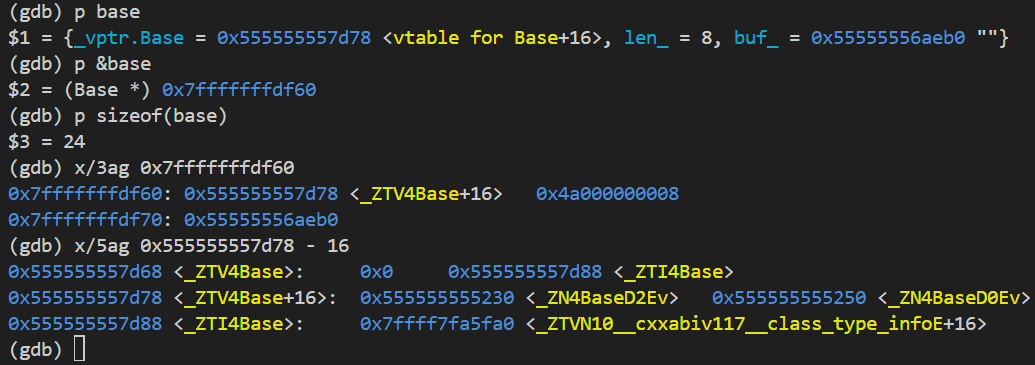 接下来,让我们通过gdb调试更深入地探究虚函数表和对象内存布局。