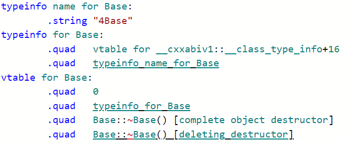 通过Compiler Explorer,可以看到生成的虚函数表的布局以及typeinfo相关内容(这个后文会详细介绍):