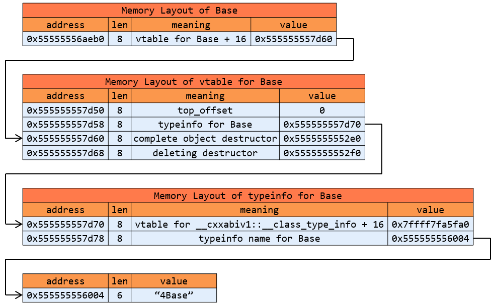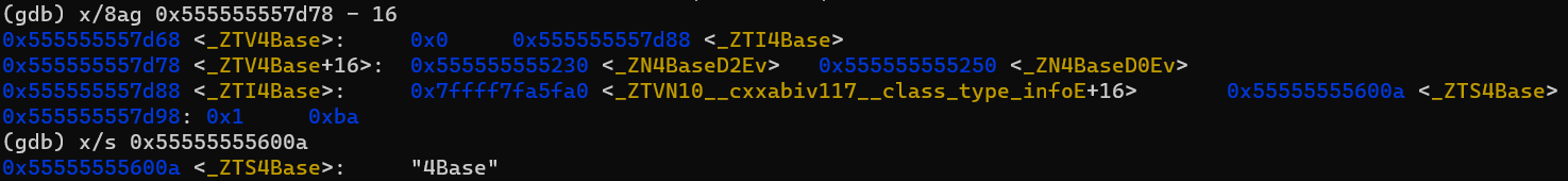 typeinfo与RTII (Run-Time Type Information) 相关,它记录了一个对象的运行时类型信息。通过gdb看,vtable中的typeinfo同样是存放在.data.rel.ro段的一个指针,它指向了一个 __cxxabiv1::__class_type_info 实例。 __class_type_info 是一个在命名空间 __cxxabiv1 中的类,它继承自 std::type_info ,其中 std::type_info 中的 __name 成员保存了一个字符串常量,即类型的名字。( std::type_info 在typeinfo中定义, __class_type_info 在cxxabi.h中定义)