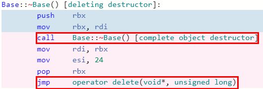 因此,需要两个destructor,complete object destructor内部不调用 operator delete ,用于析构临时对象或者 static 对象;deleting destructor内部会调用 operator delete ,用于释放堆对象。通常,deleting destructor内部会先调用complete object destructor,再调用 operator delete 。比如,本文开头的例子,deleting destructor对应的汇编代码是这样的: