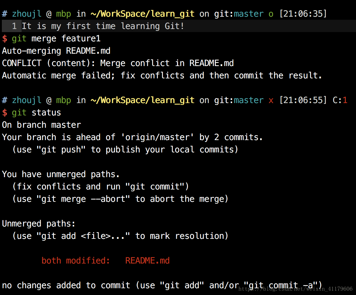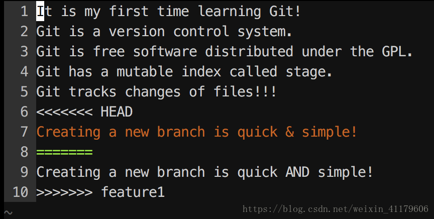 git pull // 出现合并冲突提示,重复2修复冲突,再次pull,成功