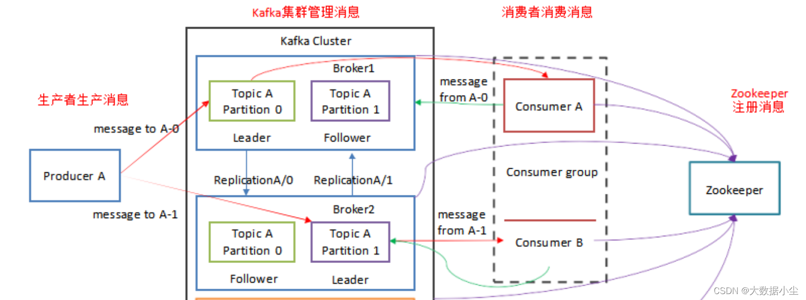 Kafka 如何保证数据可靠 对头,所以这就涉及到一开始分区的副本的leader 和follower 之间通信同步数据的问题,假设producer 发送一条消息到topiA 的partition-0,它有三个副本,我们要保证数据可靠肯定要确保老大leader把数据拿到手了,告诉了其他的副本兄弟之后,然后给producer 发送一个ack 表示确认消息已经收到了,你开始发送下一条消息吧,哥们。如果不怎么同步又会说你tm符合cap 定理嘛;所以这就涉及到了我们的topic 的分区的副本机制了,副本就是做容错的嘛,即使老大挂了,副本顶上。