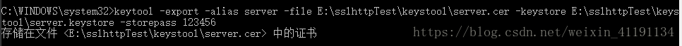 keytool -export -alias server -file E:\sslhttpTest\keystool\server.cer -keystore E:\sslhttpTest\keystool\server.keystore -storepass 123456